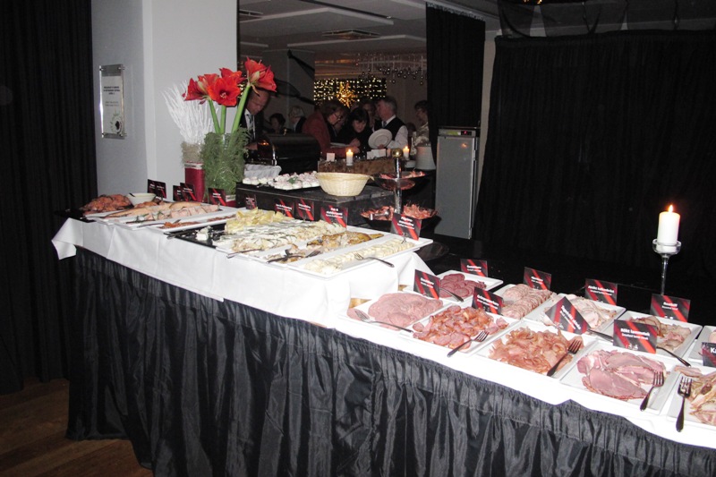 När vi intagit våra platser under dinglande silverfärgade julkulor försökte servitrisen få ordet för att berätta om de olika borden där maten serverades.  Vatten fanns på bordet men ville du ha något starkare så låg baren inom räckhåll. För att vi inte skulle behöva vänta i kö så fanns det ytterligare en uppsättning med bord med samma upplägg. Men på julbordet är det lite kul att stå i kö, välja och prata om maten och annat i juletid.