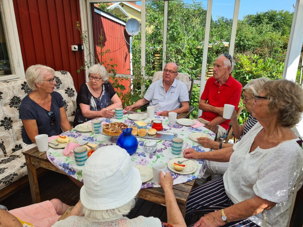 Fika på altanen, Birgit, Monica, Torsten, Håkan, Gunnel, Kerstin, Elvy och Anny