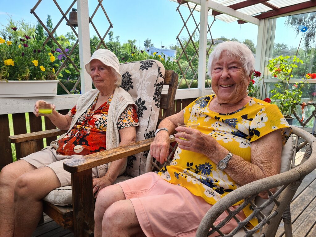 Elvy svalkar sig i en läskande dryck och Anny är glad och njuter av en lyckad dag